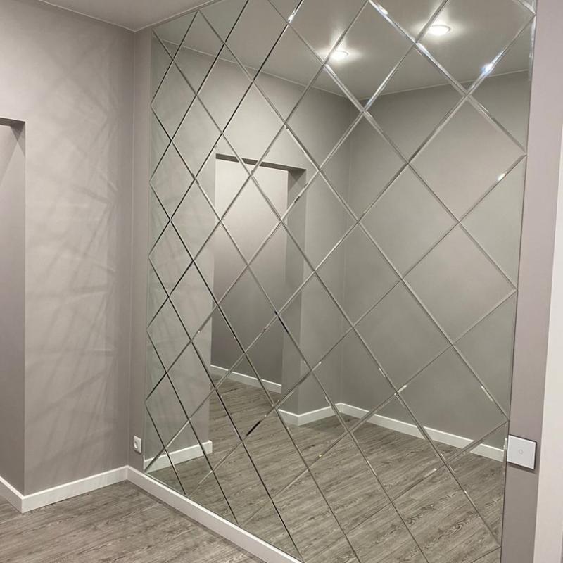 Использована квадратная серебристая зеркальная плитка размером 18х18.