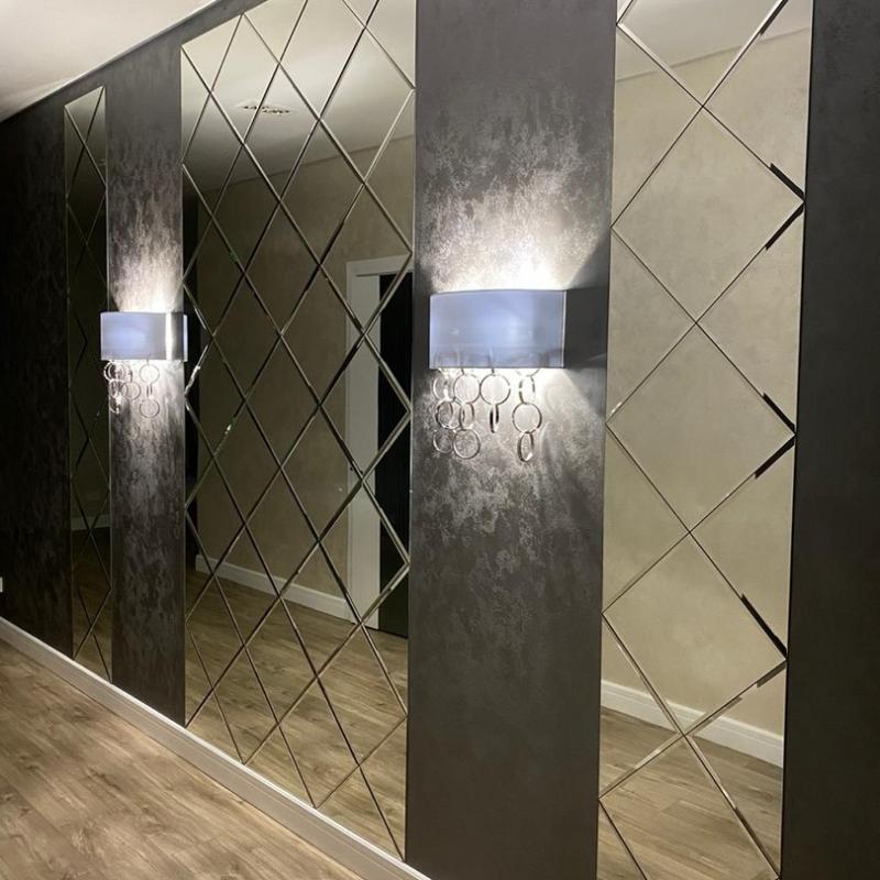 • Зеркальное панно в салоне, Москва, серебряная глянцевая плитка квадратной формы